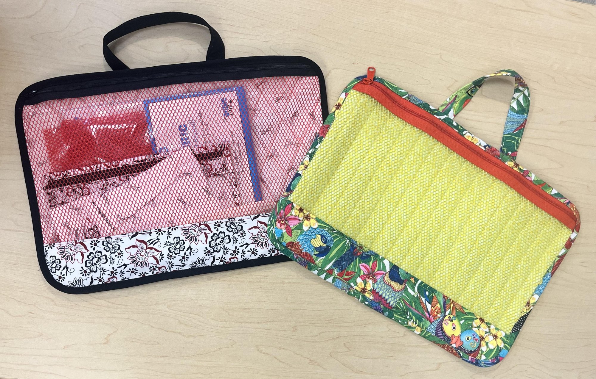 Store and carry all your project pieces or supplies in this handy zippered bag with attached handle. Fabric quilted with Soft and Stable makes a sturdy base and the mesh front affords great visibility of contents. The added back pocket is great for carrying a small cutting mat.